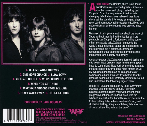 Wydany w 1983 roku i wyprodukowany przez Jacka "Aerosmith" Douglasa imponujący debiutancki longplay, idealnie równoważy upalny hard rock z awangardowymi wpływami rocka progresywnego, a płyta stała się najszybciej sprzedającym się debiutanckim albumem w długiej historii Atlantic, ustanawiając Zebrę jako jedną z najbardziej ekscytujących premier w tamtych czasach.